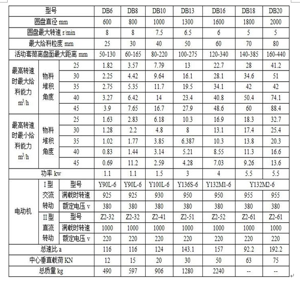 DB型圓盤給料機(jī)為容積式給料設(shè)備,它能均勻連續(xù)地將物料喂送到下一設(shè)備中去,喂料可以調(diào)節(jié)。能喂送粉狀、粒狀、或小塊狀的物料。例如:煤粉、水泥、熟料、石灰石、粘土等。不適合于喂料粘度較大,不易流動或流動性特別良好的物料。